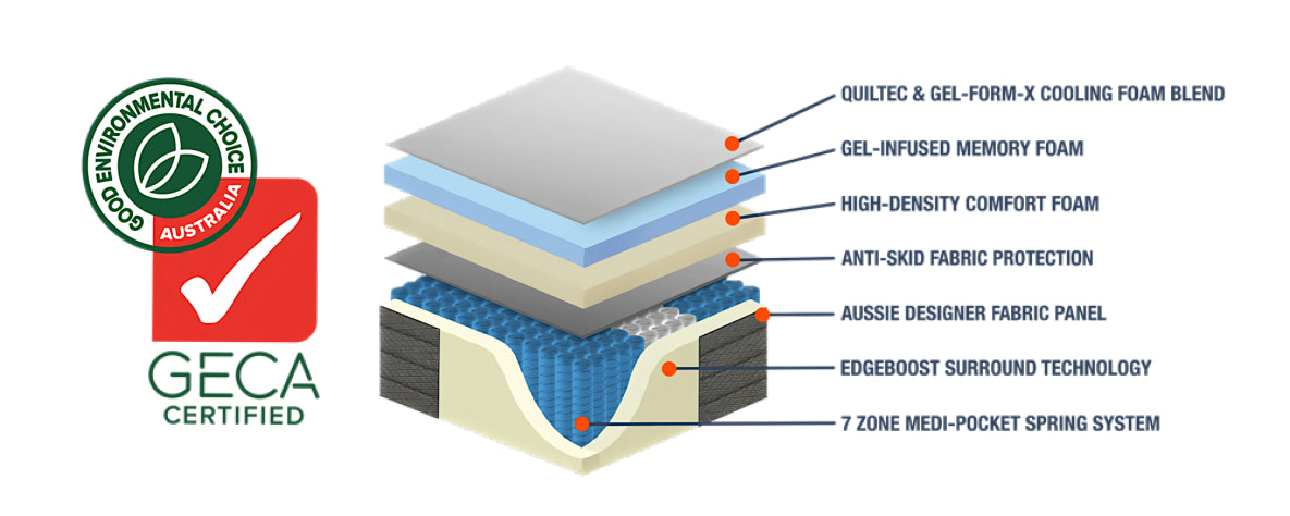 The Orthopaedic Ultimate is made from premium quality materials that are certifiably good for the environment and your health. Our Australian-made foams, are GECA certified (Good Environmental Choice Australia).Furthermore, we’ll also take away your old mattress and have it recycled by Bed Collect for no extra cost!
